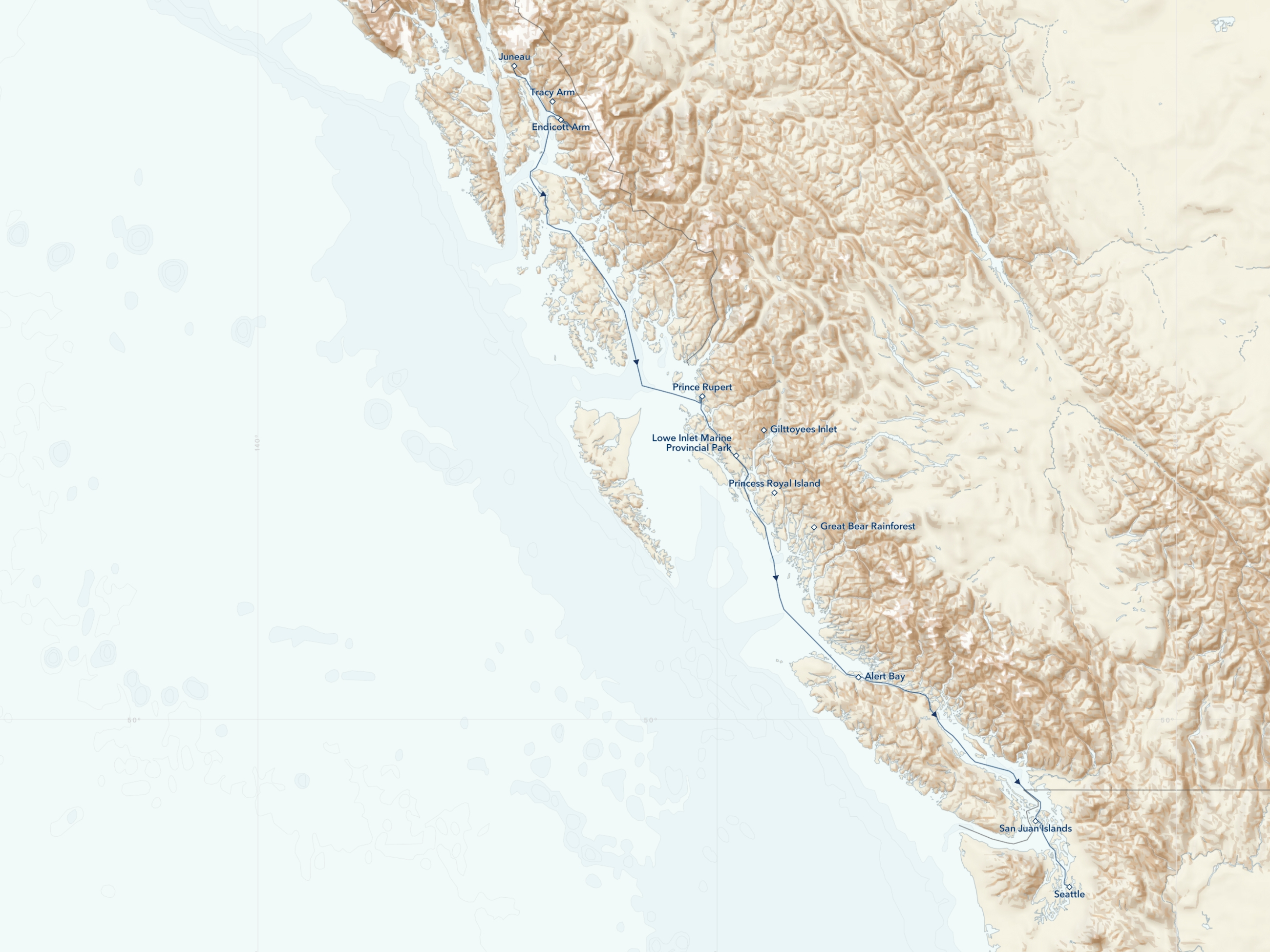 Embark on an unforgettable wildlife expedition through some of the most remote and biodiverse regions of North America: Alaska, British Columbia’s Great Bear Rainforest, and the San Juan Islands. This 14-day small ship cruise beginning in Juneau, Alaska and ending in Seattle, offers exceptional opportunities to observe iconic wildlife in its natural habitat – including Grizzly Bears, Spirit Bears, Humpback Whales, and Orcas. Along the way, enjoy cultural encounters, glacier exploration, and kayaking adventures through pristine coastal wilderness.
