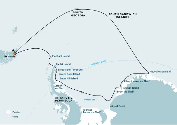 Extended voyage including Weddell Sea & South Georgia. Itinerary does not include the Falkland Islands