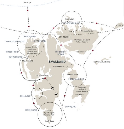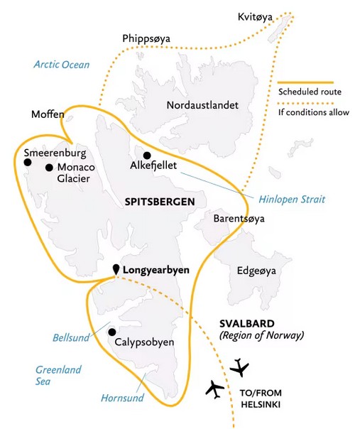 Please note that our polar itineraries are written to provide a flavour of each voyage. The actual route will be decided by the captain and expedition team in accordance with prevailing ice, weather and sea conditions and opportunities to see wildlife and wilderness scenery.
