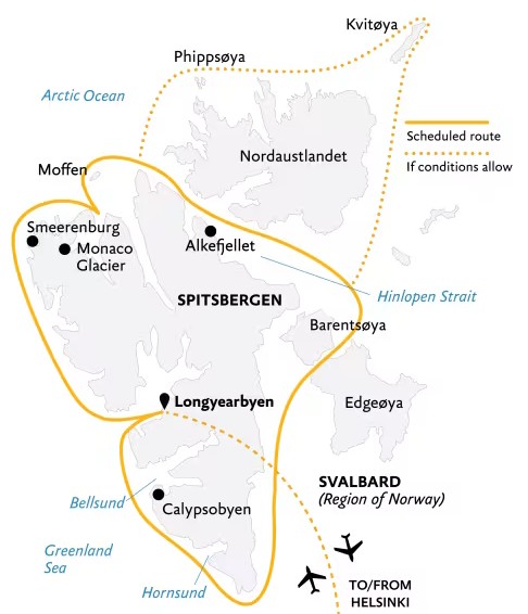 Transfer Package (included): 1 pre-voyage hotel night in Helsinki and return charter flights Helsinki-Longyearbyen