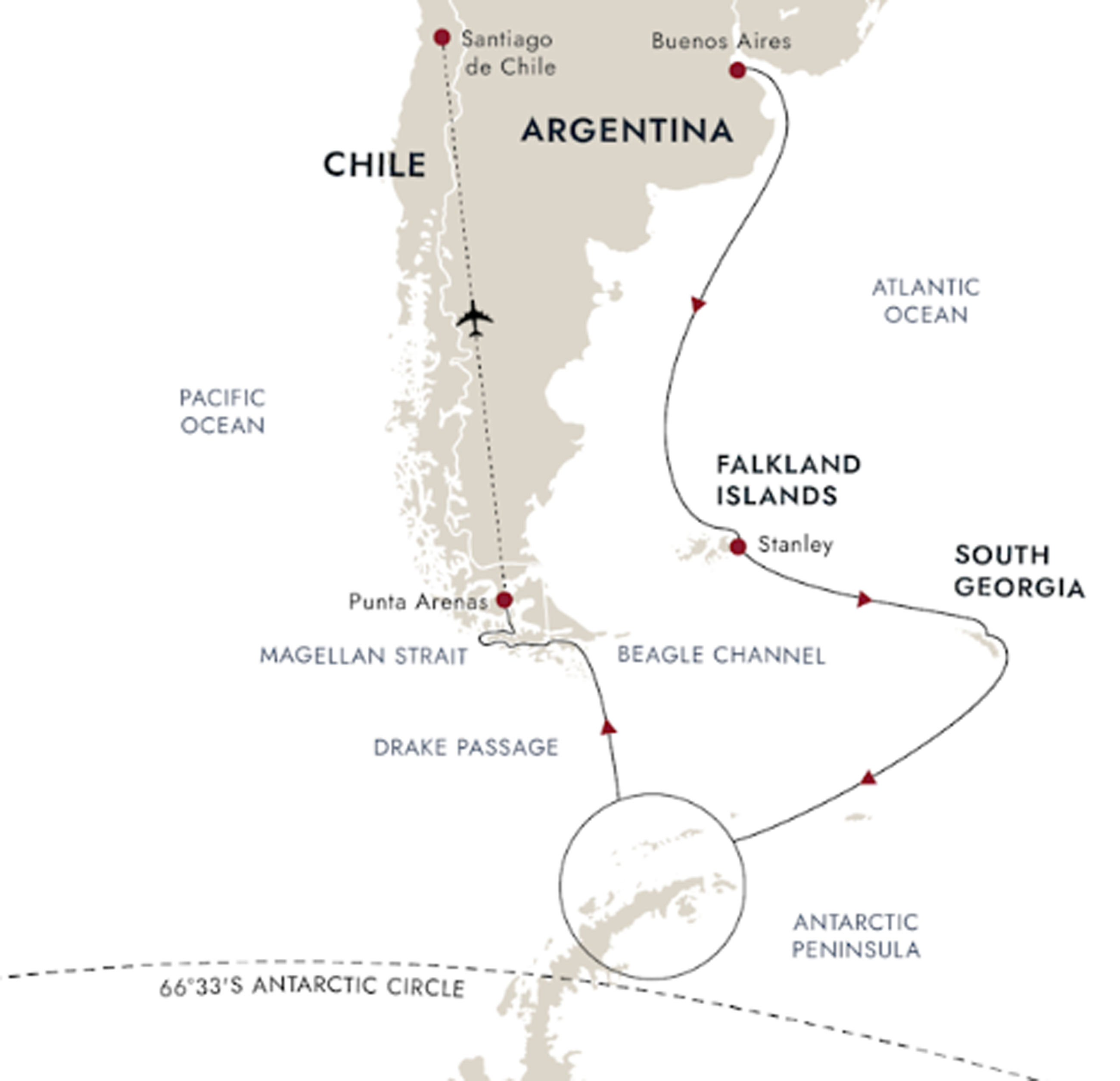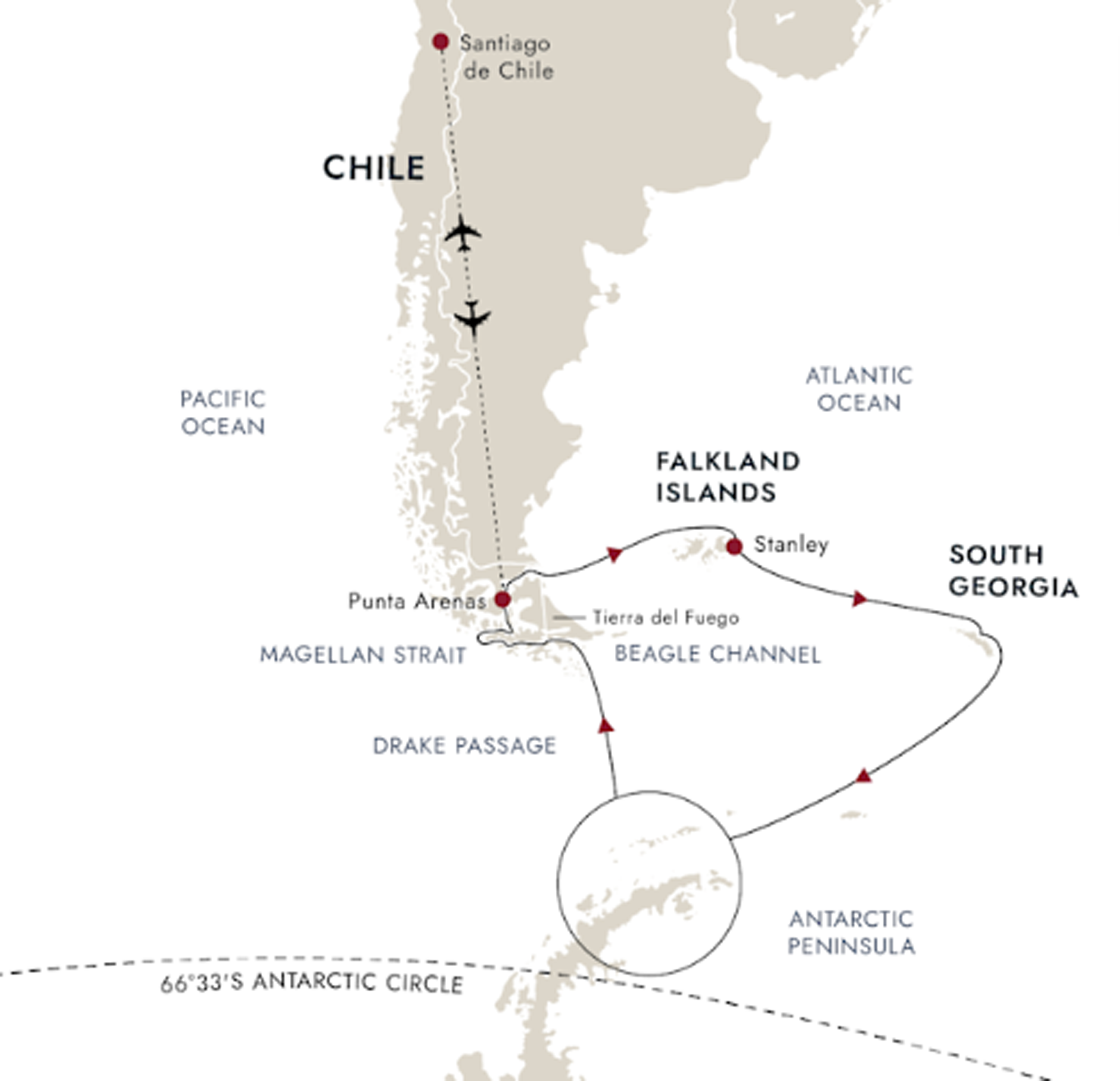 Santiago - Punta Arenas - Antarctica - Falklands - South Georgia - Punta Arenas - Santiago (23 days)