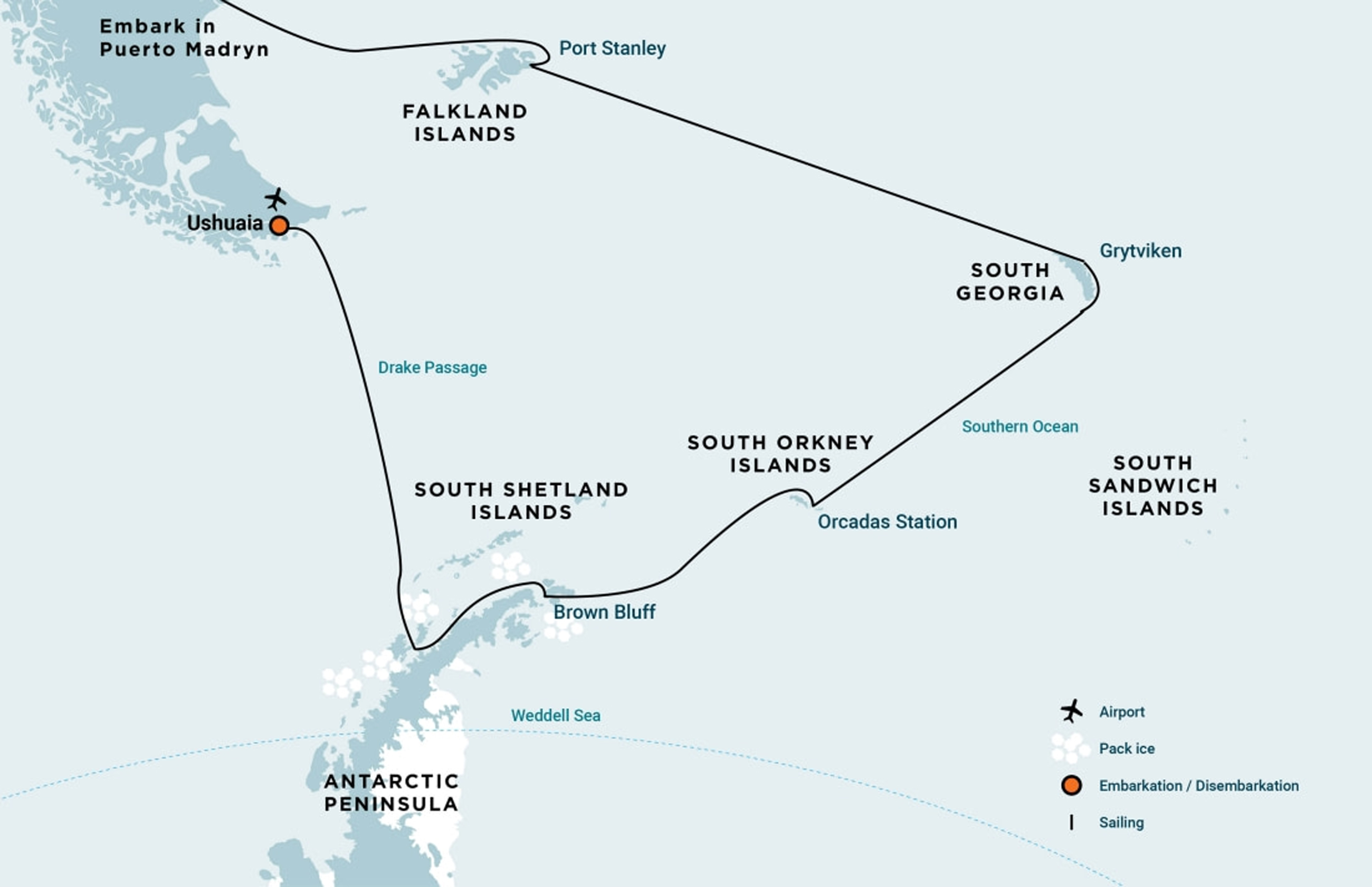 This is a sample only based upon a 19 day voyage. The final itinerary will be determined by the Expedition Team and is influenced by local conditions, like ice and weather - in particular actual or anticipated headwinds affecting crossings of the Drake Passage.