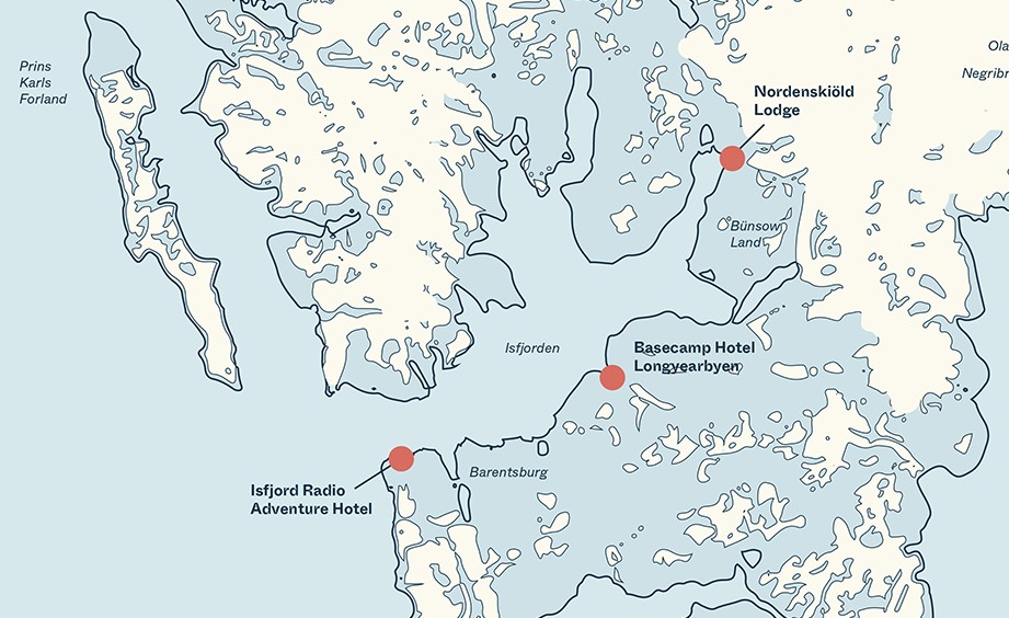 The landscape unfolds differently every day. In February and early March, the light paints the snow in soft pastels. By April, the days stretch almost endlessly under the Arctic sky. You will travel through raw beauty, stopping along the way to enjoy an expedition lunch in the stillness of the wild. The exact route depends on snow and weather - but soon enough your lodge will come into view. By afternoon, you will arrive at Isfjord Radio, a former outpost turned boutique lodge — and the last western point before Greenland. Enjoy a warm welcome and a well-deserved sauna which is perched on the cliff with panoramic sea views.