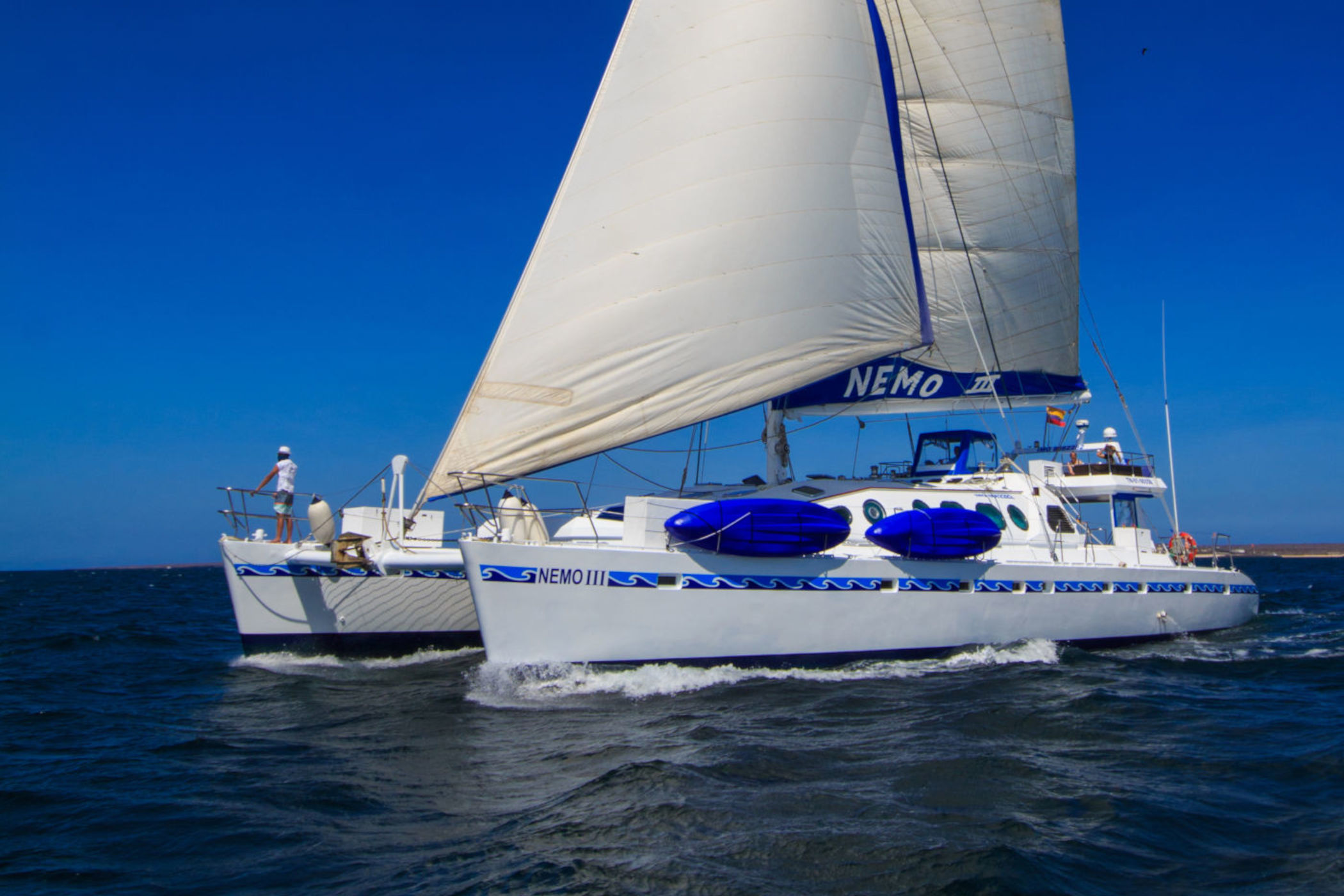 Nemo III is a sail and motor catamaran cruise yacht which can accommodate up to 16 guests in 8 double cabins. Every cabin is air conditioned, ensuite and stocked with amenities. Showers also work with hot and cold water. Cabins 1, 2 and 7 have twin beds, cabins 3 and 6 have a lower double bunk and a single upper bunk and cabins 5 and 8 have double beds.
