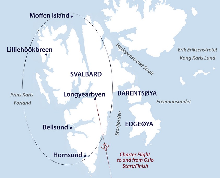 Includes: 1 pre-voyage hotel night in Oslo, return charter flights Oslo-Longyearbyen-Oslo, free Expedition Jacket
