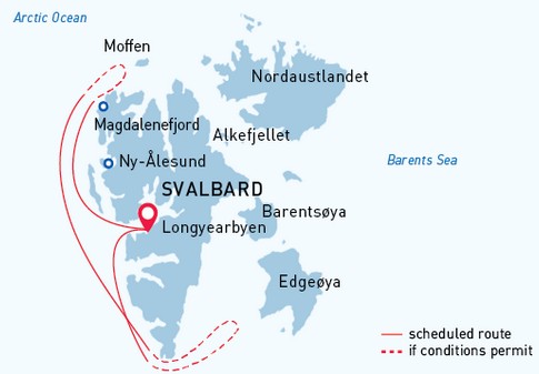 Includes: return flights Oslo-Longyearbyen-Oslo, 1 pre-voyage hotel night in Longyearbyen