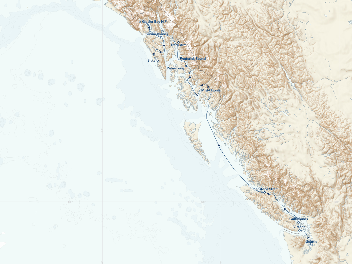 Sailing south through Alaska and British Columbia from Glacier Bay winds you through some of the region’s best-known passages and little visited tributaries offering incredible wildlife, scenery and culture. Your nimble expedition small ship and first class onboard natural history guide team make this journey a truly iconic National Geographic experience through the Big Country.