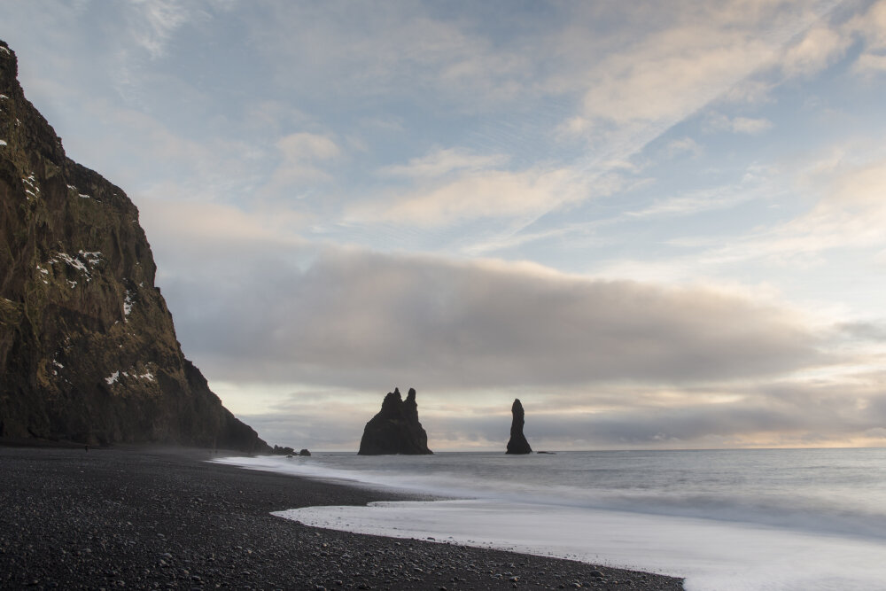 Afterwards, you will head towards Reynisfjara, where you can stroll along the black sand beach known for its famous basalt columns and caverns. Witness the Reynisdrangar cliffs and basalt rock stacks that rise from the sea; Icelandic legend has it that they are mischievous trolls turned into rock by the rising sun.